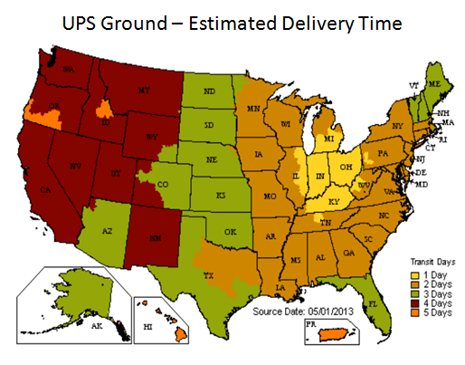 Buckeye typcially ships the same day, or less commonly, the day after an order is placed. The majority of our shipments are sent UPS Ground or FedEx Ground. Estimated delivery times for these services are similar, and are shown below. See our policies page for additional shipping information.